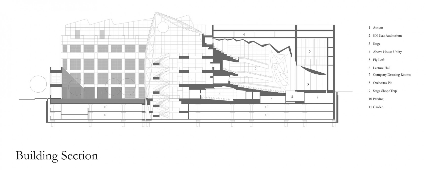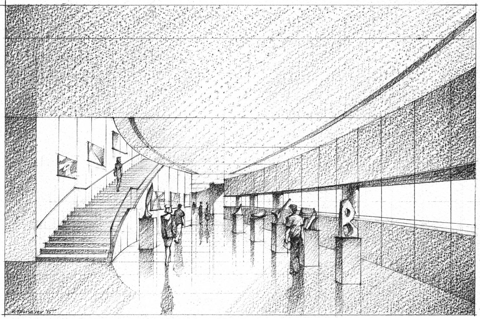 This design concept for the Korean American Museum of Art and Cultural Center is about Time; past. present and future. The awareness of the flow of time from Future to Present to Past is central to a rich enjoyment of the knowledge of human culture. The plan of the Museum and Cultural Center is based on a simple diagram interpretation of one aspect of the traditional Korean yin-yang symbol of the unity of opposites in the universe. Coincidentally, the symbol is similar to a Chinese character meaning “a stream of water”. The symbol is conceived of as the essence of and basis for this design. The design realizes this idea in the basic organization of forms and spaces. The activities and presentations within the building with the most profoundly temporal characteristics take place in the Garden, Auditorium, and Lecture Hall. Activities and presentations in these areas are very much in the confluence of Past and Future. The high atrium space creates a transition between the natural and manmade. These spaces are held in place by the opposing forms of the Permanent Exhibit Wing and the Temporary Exhibit Wing.